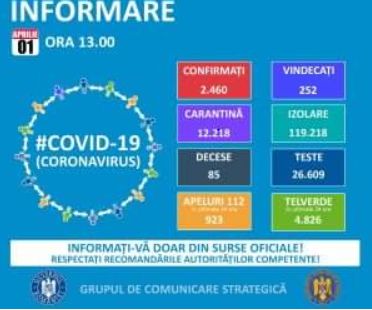 Până astăzi, 1 aprilie, pe teritoriul României, au fost confirmate 2.460 de cazuri de persoane infectate cu virusul COVID – 19 (coronavirus). Dintre persoanele confirmate pozitiv, 252 au fost declarate vindecate și externate (84 la București, 56 la Timiș, 26 la Iași, 21 la Caraș-Severin, 12 la Constanța, 20 la Prahova, 8 la Dolj, 5 la Brașov, 8 la Cluj, 5 la Galați, 2 la Bihor, 1 la Brăila, 1 la Mureș, 1 la Neamț, 1 la Alba, 1 Argeș).